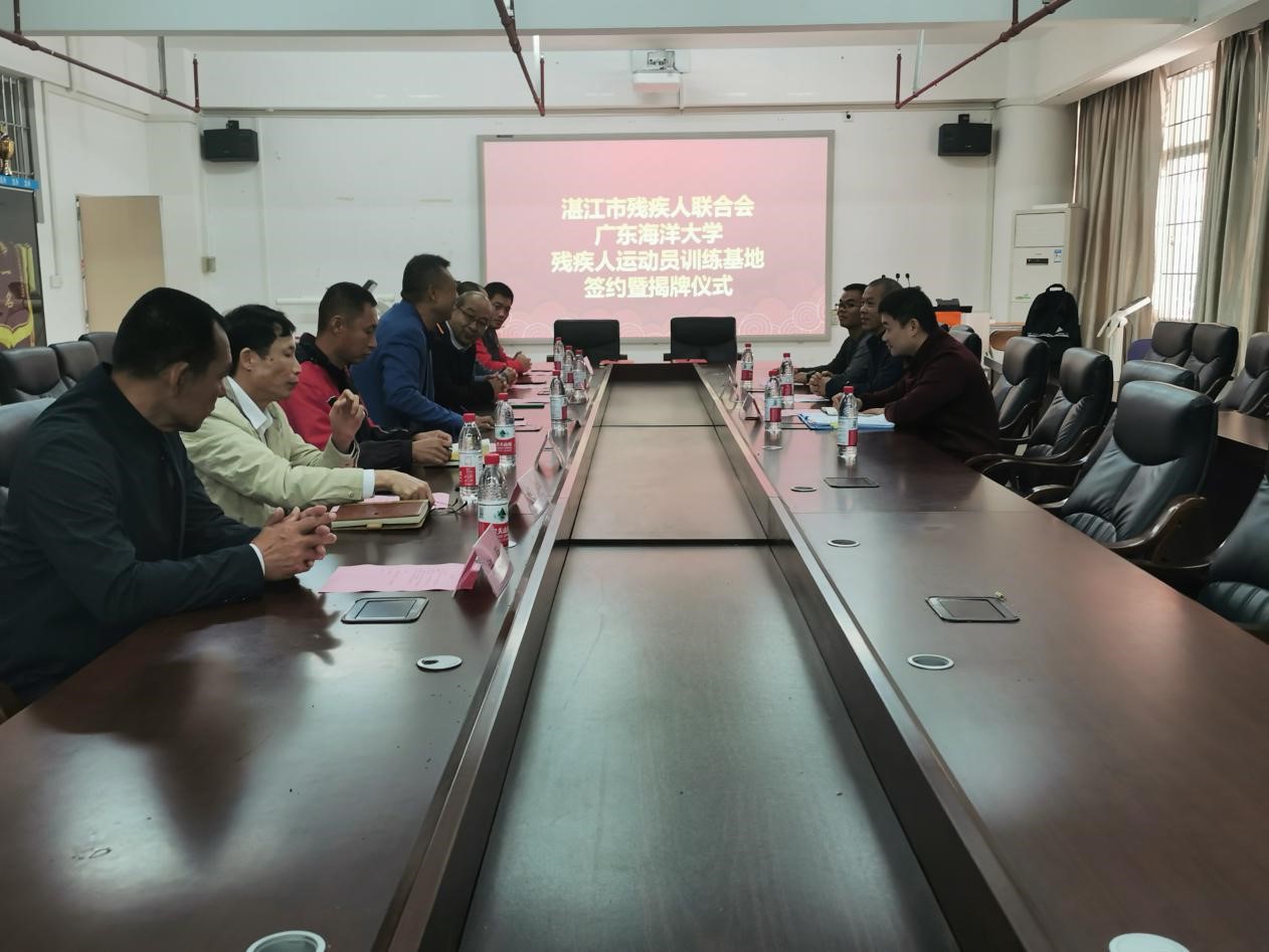 就合作共建训练基地进行了现场签约,并就训练基地成立的必要性、重要性以及下一步共同促进全市残疾人体育发展等进行了深入的交流和探讨,决定在今后进行更广泛更深层次的合作。2022年,第九届省残运会将在清远市举行,湛江市市拟参加13个大项的比赛。其中,田径、聋人网球、聋人足球、盲人足球、跆拳道、自行车、游泳等项目的训练备战工作,将计划继续安排在海大训练基地进行,为我市残疾人运动员取得更好成绩,为持续推进我市残疾人体育工作作出新的贡献。