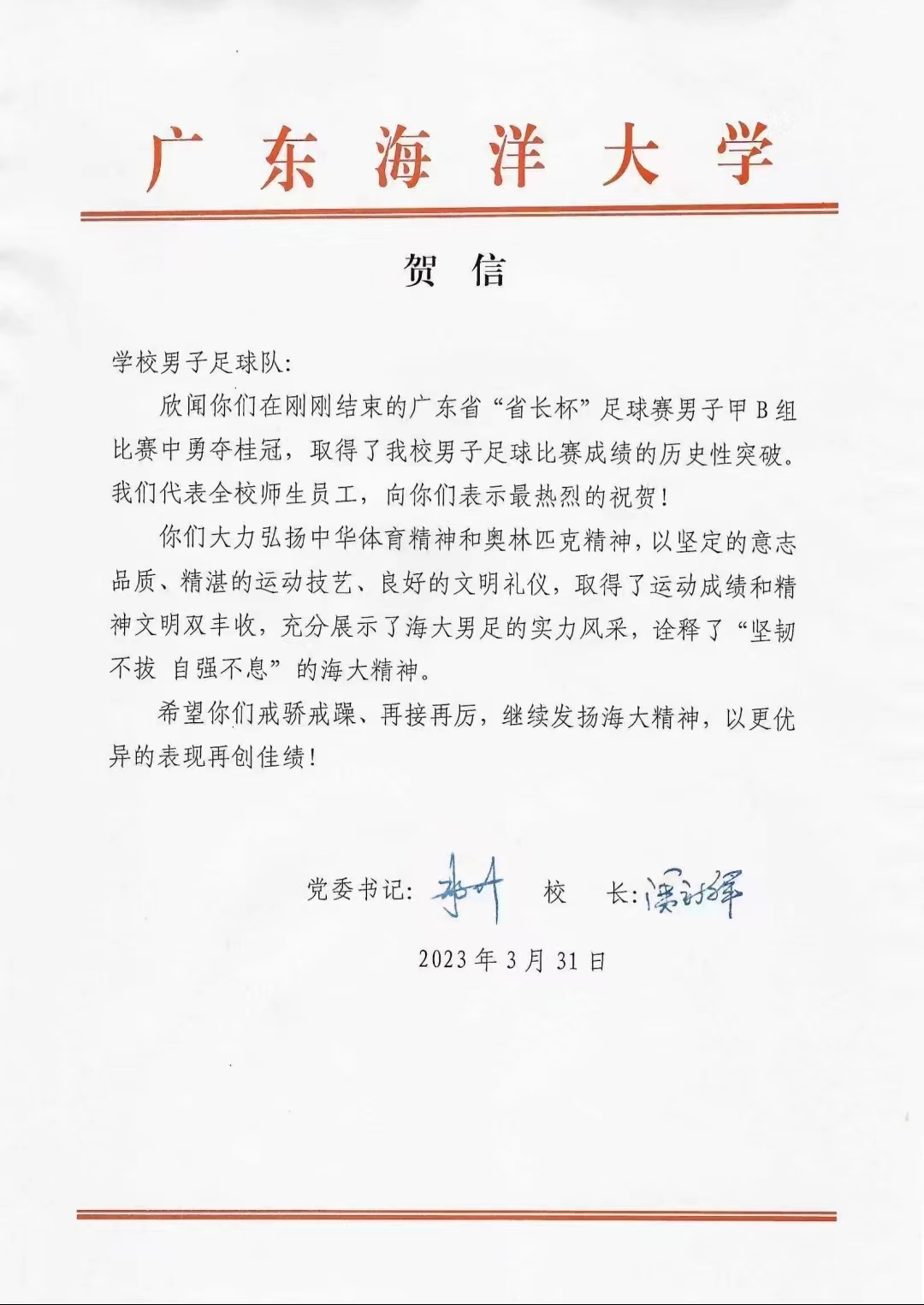 天美传媒 足球队在学校领导的大力支持下,积极备战,奋力拼搏,经过7场比赛的激烈角逐,荣获冠军,为学校争得荣誉,学校党委书记杨洲、校长潘新祥为此写了贺信。