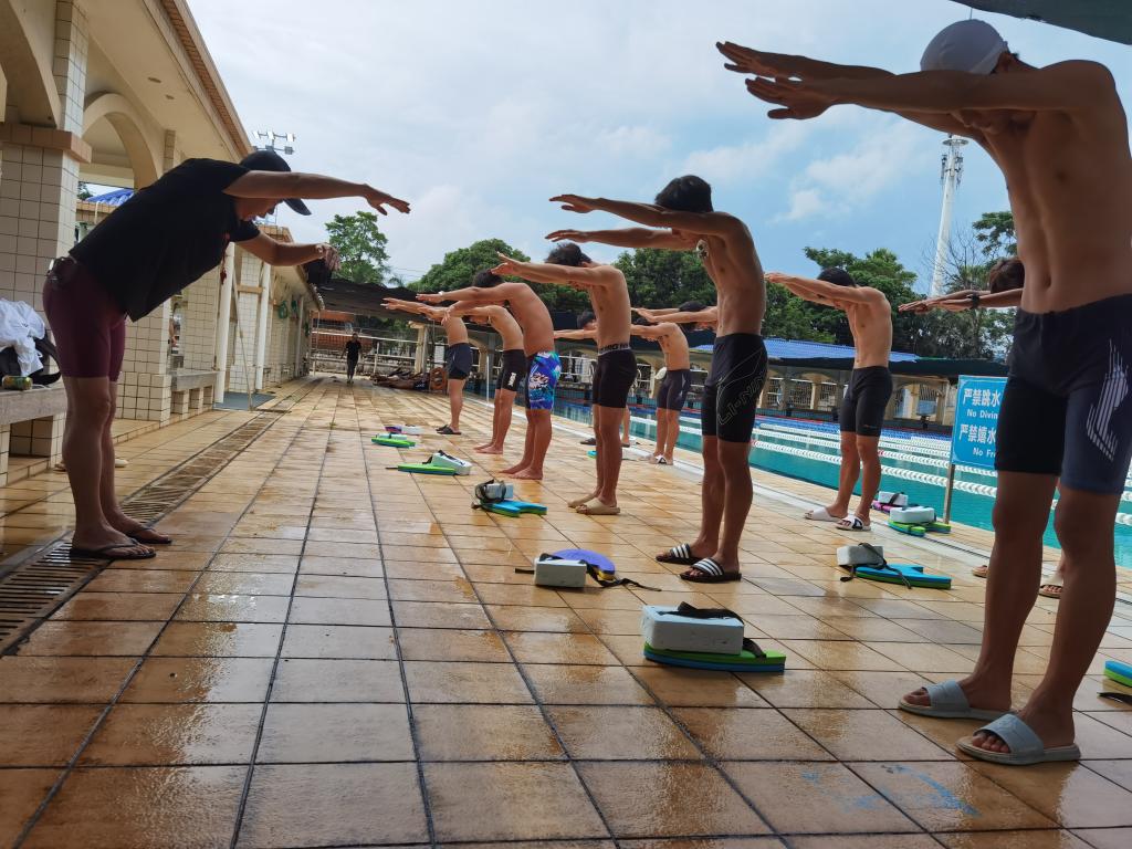 庞锦华老师正在组织学生自由泳陆上训练