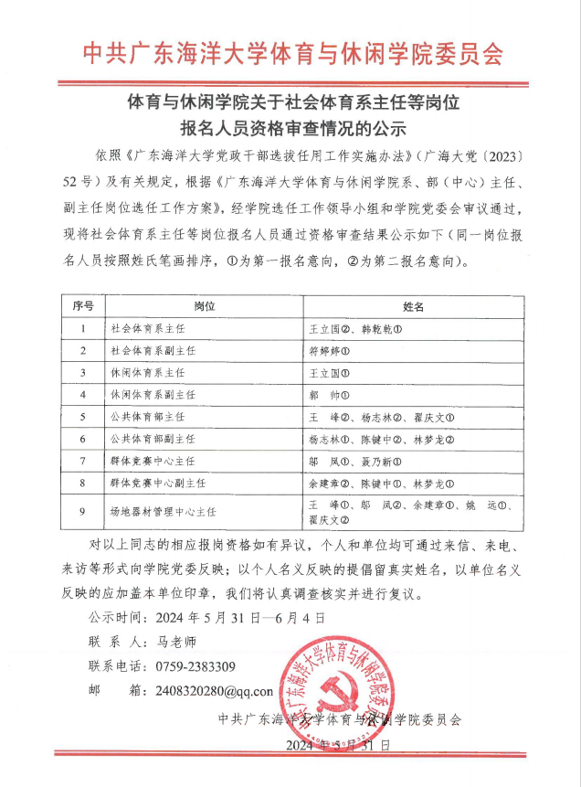 天美传媒 关于社会体育系主任等岗位报名人员资格审查情况的公示