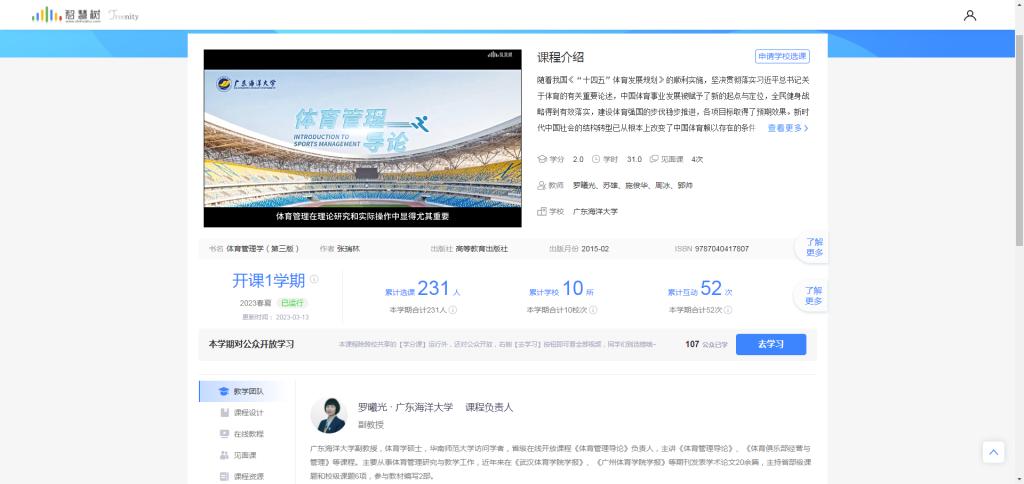 天美传媒 天美传媒 罗曦光副教授负责的广东省在线开放课程建设项目《体育管理导论》,由课程负责人及教研团队成员苏雄教授、施俊华副教授、周冰教授、郭帅博士等倾心制作,于2023年3月在智慧树平台上线。